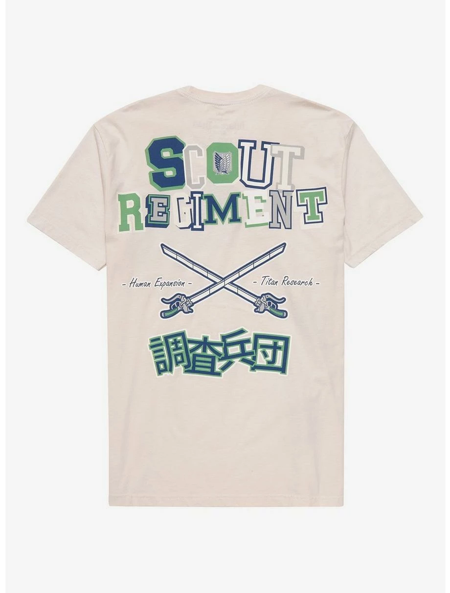 Rep some Survey Corps style with this fashionable tee! Inspired by the epic anime, Attack on Titan, this tee dons a rebellious style. Featuring mixed font “Scout Regiment” lettering above crossing swords on the back, the front sports collegiate “SR” lettering with the iconic Scout Regiment crest in the “R.” With Japanese kanji lettering on the front and back, this tee is the perfect look for fans of the action-packed anime.Â