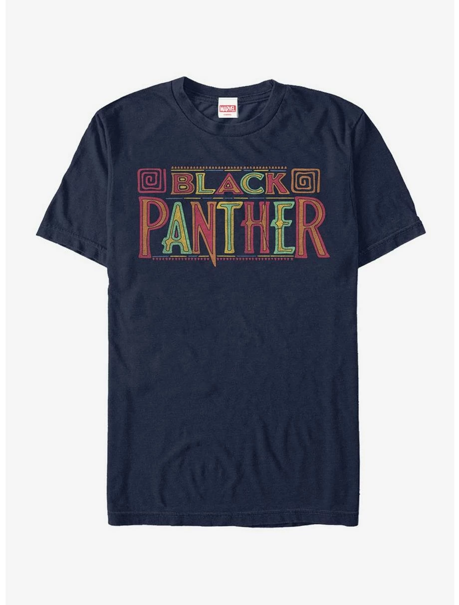 Don’t be fooled by his dark Black Panther suit, T’Challa appreciates bright colors too with the Marvel Black Panther 2018 Bright Title Men’s T-Shirt. A distressed text reads “Black Panther” in several colors to add a little more flare to Black Panther’s regular outfit.