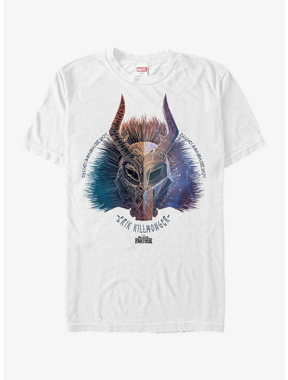 Erik Kilmonger has his eye on the throne of Wakanda but he’s also pretty excited about getting his hands on the Marvel Black Panther 2018 Erik Kilmonger Men’s T-Shirt. This cool Kilmonger shirt shows off the infamous mask of Black Panther’s nemesis, Kilmonger, in a cool ombre style that will be sure to make you want to wear this awesome villain tee!