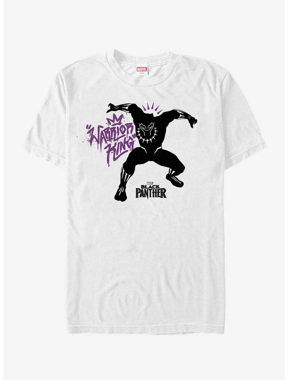 Get ready to defeat the villains, Kilmonger and Klaue, with the awesomeness of the Marvel Black Panther 2018 Warrior King Men’s T-Shirt. There’s no stopping the Black Panther when he is wearing this cool Marvel shirt that reads “Warrior King” in purple text and portrays a graphic of T’Challa ready for battle.