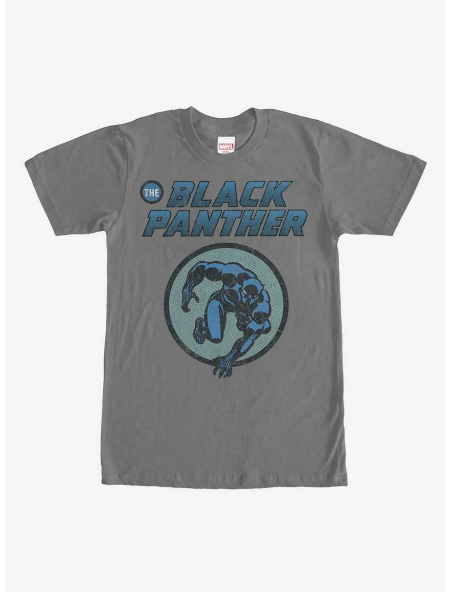 White Wolf better watch out because his adoptive brother, T’Challa, is on his trail! T’Challa, or Black Panther, is portrayed in distressed blue and black print leaping through a circle border with “The Black Panther” logo above him on this gray Marvel shirt.