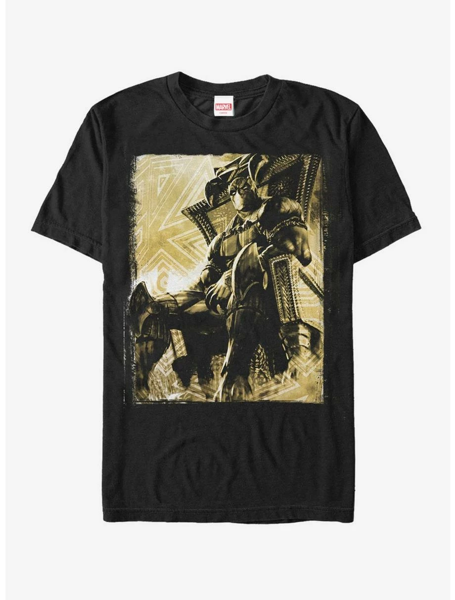 T’Challa must first defeat the challengers to his throne before he can be allowed to wear the Marvel Black Panther Throne Black T-Shirt. The Black Panther is shown sitting on the throne of Wakanda in a cool smudge-style print on this black Marvel shirt. 100% Cotton.
